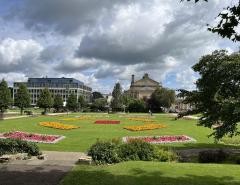 廃墟のままの建物と手入れの行き届いた庭。 |